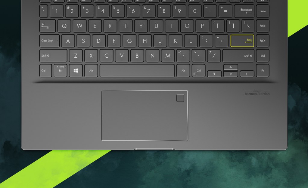 Bàn phím full size với chi tiết được bo tròn vừa mang đậm phong cách ASUS vừa pha chút thời trang, Thiết kế nguyên khối và khoảng cách phím 1.4mm cho trải nghiệm đánh máy thoải mái. điểm nhấn tại phím Enter được viền bằng màu vàng Neon độc đáo như tiếp thêm cho người dùng năng lượng.