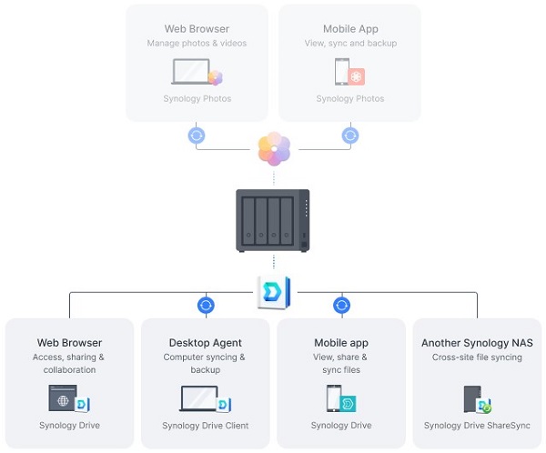 Làm việc cộng tác mà gần như không có thời gian ngưng hoạt động bằng tính năng đồng bộ hóa tập tin từ địa điểm này tới địa điểm khác, có thể thiết lập cấu hình tự động đồng bộ tập tin hoặc thư mục riêng lẻ giữa các thiết bị Synology, cho phép truy cập tập tin liền mạch.