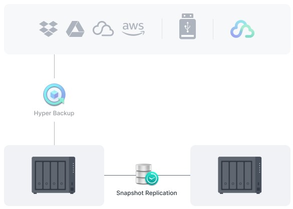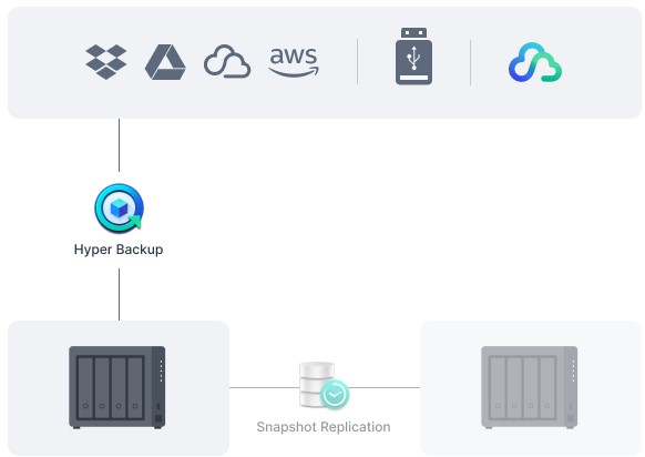 Bảo vệ tất cả dữ liệu, ứng dụng và cấu hình trên hệ thống Synology bằng các bản sao lưu toàn diện theo lịch trình tới máy chủ cục bộ và máy chủ từ xa, ổ đĩa ngoài hoặc điểm lưu trữ đám mây, bao gồm cả Synology C2 Storage.